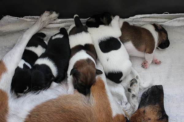 První týden za námi. Štěnda se mají dobře. Zatím stále jen papají a spinkají. O leva postupně je Cooper, Cersei, Caesar, Casper a Cliff.