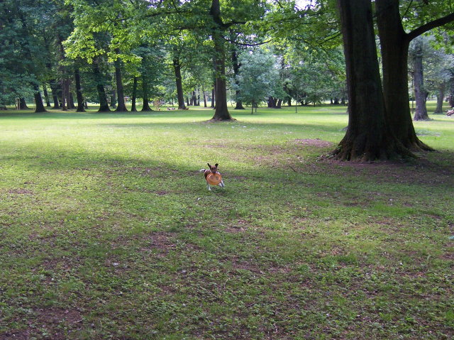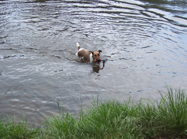 Naše pravidelná vycházka s Efrou na Čábelnu spočívá v jízdě na kole (u kola) a pak v házení frisbee a plavání za míčkem.